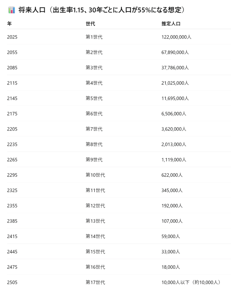 出生率がこのままだと2100年代末には1000万人を切り2200年代末には100万人を切ることになる。