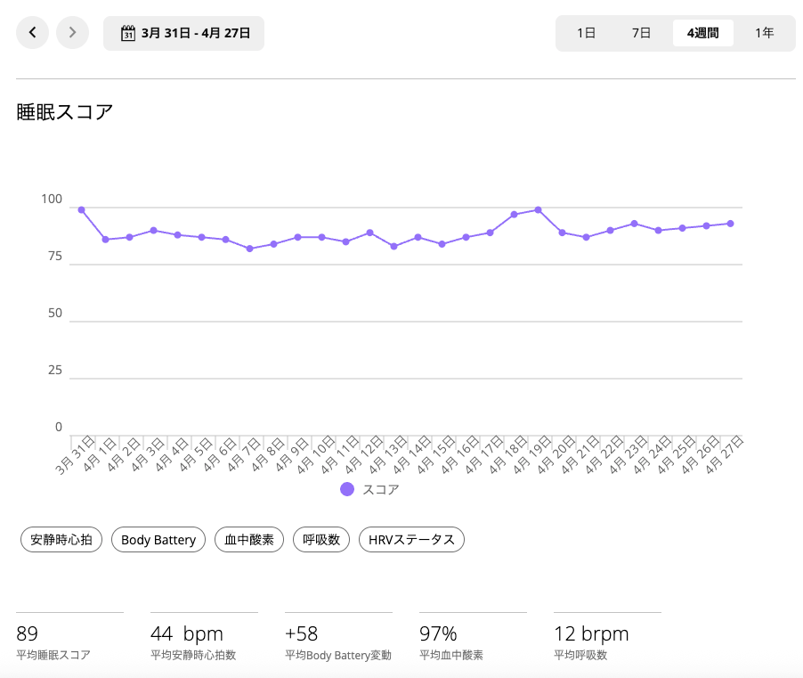 ちなみにここ4週間の睡眠スコアはこんな感じになっている。